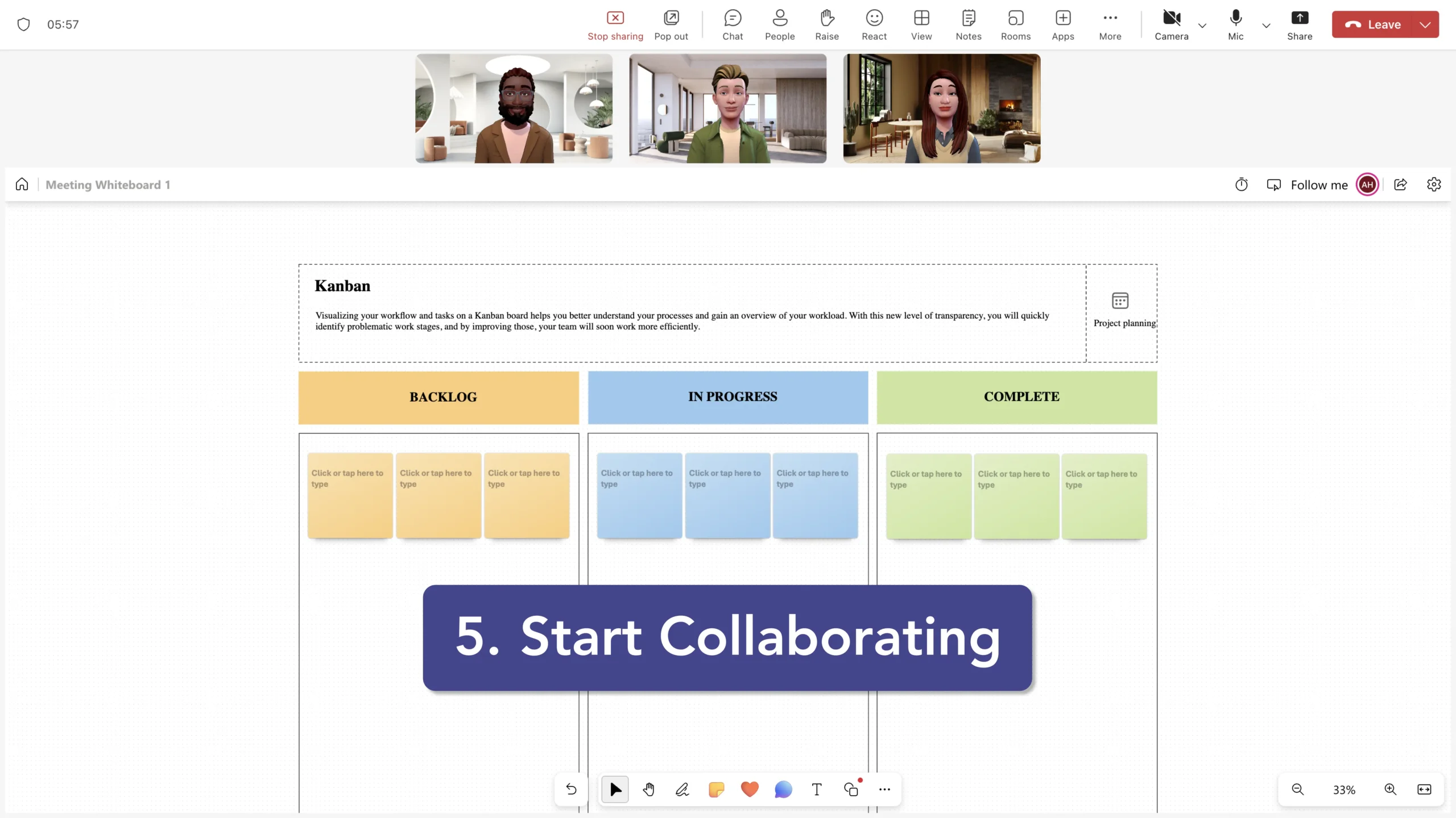 - Start Collaborating: Once the whiteboard is open, you and other participants can use various tools such as pens, highlighters, sticky notes, and text boxes to collaborate in real-time. The whiteboard is automatically shared with all meeting participants, allowing for easy collaboration.