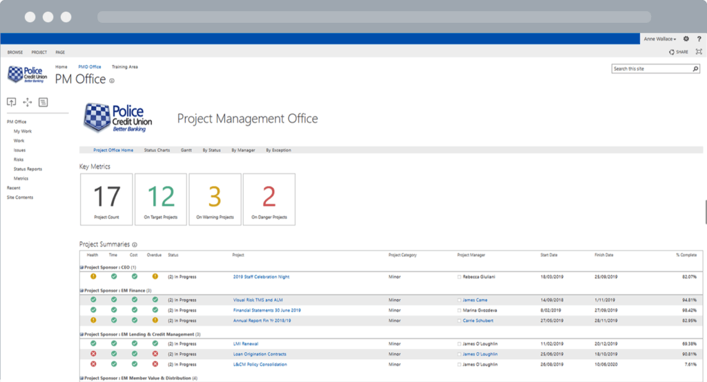 With BrightWork, Police Credit Union now have a consistent framework to plan and manage projects. They have real time visibility into the status and health of every project, and they can view assigned tasks across projects and teams to track workload and identify resource gaps.