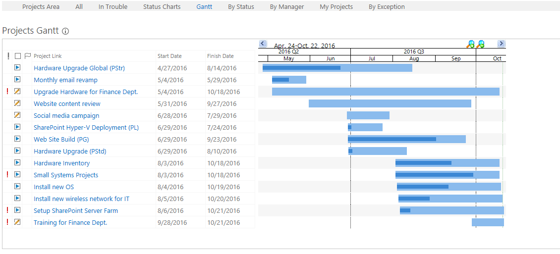 Note how there are multiple projects on the Project Summaries Gantt. Some are from the Projects Tracker list that is built into the Project Office itself, and the others are from the project sites you created in the previous exercises. - Click Status Charts on the Tabs bar.