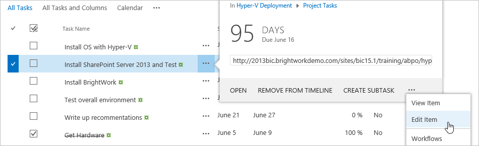 - Click Tasks Update on the Quick Launch and select Edit Item from the menu of one of the tasks.