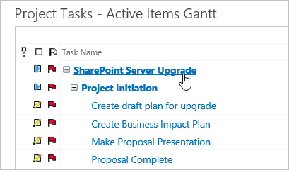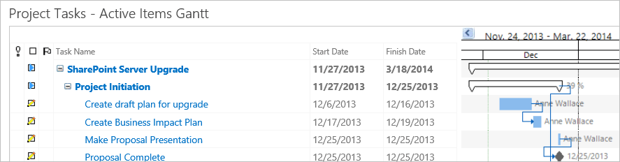 - Switch back to SharePoint and refresh the Gantt view. The completed items will disappear (as this view only shows active items) and the % Complete of the project will update.