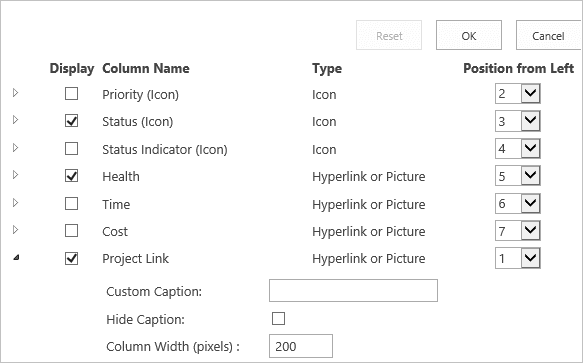 - Select 1 from the Position from Left menu for the Project Link column and change the column width to 200 and click OK.