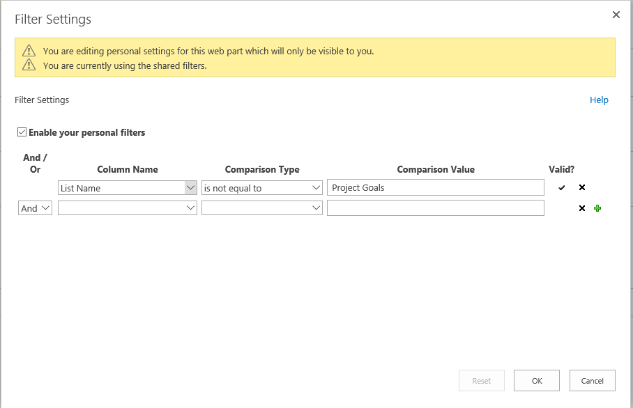 - Click the Green plus icon on the right to add another filter and create a similar filter for the Project Risks list.