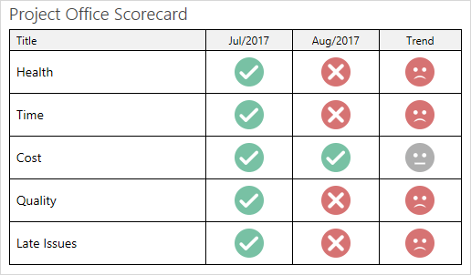 Note the Project Office Scorecard shows the history of multiple Project Office Metrics. It also shows a trend icon that indicates if a metric has recently changed for better or worse.