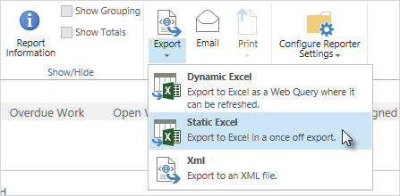 - Click Export | Static Excel on the Reporter Tools ribbon.